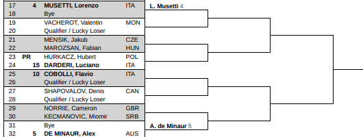 De Minaur är svag på grus men kanske inte så svag som man med sitt spel borde vara. Han har fått en bra lottning här för att kunna hålla sin seedning trots allt men det kan nog bli tufft mot Cobolli i åttondelen för hans del.