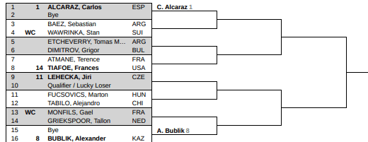 Alcaraz på plats och han borde väl studsa till lite nu till gruset, eller? Om inte annat är det klart svårare att strula bort matcher på grus än vad det är på hardcourt. Baez i första kanske, Tiafoe i andra matchen, Bublik, Lehecka eller Griekspoor i kvarten. Det blir ibland lite ointressant att spåna kring Alcaraz och Sinners lottningar för på pappret finns det aldrig några hot. De måste hota sig själva så att säga. Men överlag, ganska enkel lottning för Alkis tycker jag.