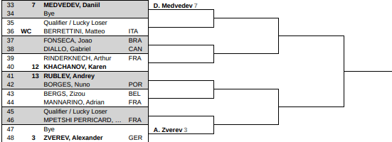 Vi är nere på den undre halvan av lottningen, tredje kvarten. Zverev högst seedad och Rublev är enda hotet tidigt för hans del. Men känns väl inte glödhet just nu kanske, Rublev. De har inte mötts någonting på sistone de där två vilket kanske är bra. Eftersom jag har en rackarns tendens att blanda ihop deras namn, av absolut ingen anledning alls.