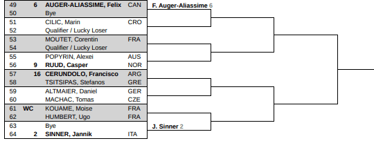 Och så ska väl Ruud kunna ta sig till kvarten nu när det vankas grus. Också en fin match i så fall, Sinner mot Ruud. Sinner fick lite tuffare lottning än vad Alcaraz fick den här gången tycker jag. Samma halva som Zverev dessutom, Sinner. Alcaraz vann lotten denna gång.
